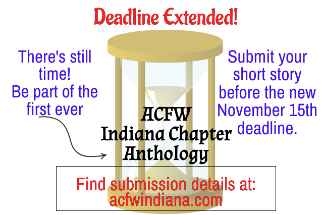 The deadline for our short story anthology has been extended! ACFW Indiana members now have until November 15th to send your story to acfwindianachapter@gmail.com. Please submit the $5 fee per entry through PayPal to abbey@abbeydowney.com or by mailed check (email the chapter to ask for address).